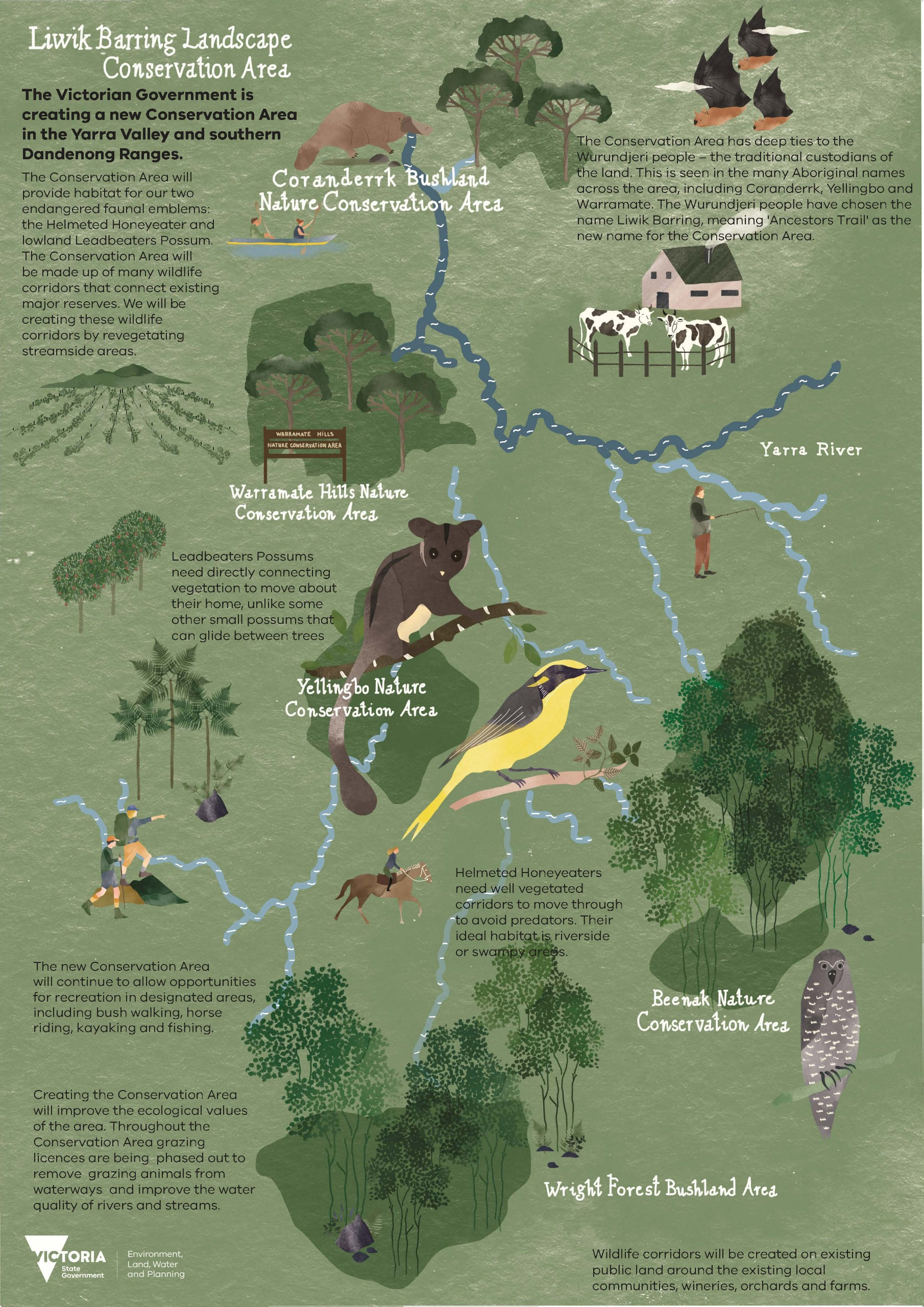 Following extensive consultation with Traditional Owners, community groups, and stakeholders, the area was renamed Liwik Barring, meaning “Ancestors’ Trail” in Woi Wurrung language. In December 2021, the Liwik Barring Landscape Conservation Area was officially proclaimed under the National Parks Act 1975, protecting 3,000 hectares of fragmented public land across the Yarra Valley and southern Dandenong Ranges.